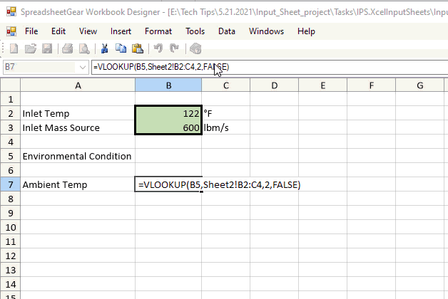 In this example, since we’ve put the applicable temps a single column to the right the syntax for VLOOKUP will be “=VLOOKUP(B5,Sheet2!B2:C4,2,FALSE)”. After this is added it should behave as follows: