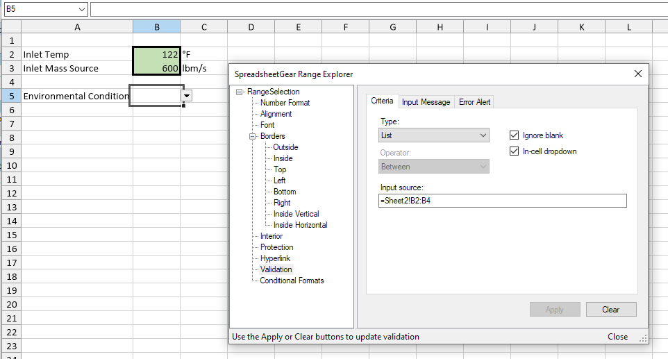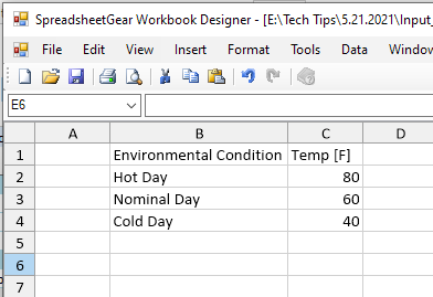 A more advanced Excel operation I like to integrate into these types of input sheets is a drop-down where multiple inputs may be tied to a given condition. In the example below I set up a scenario for given ambient temperature for cold day, hot day, and nominal day.