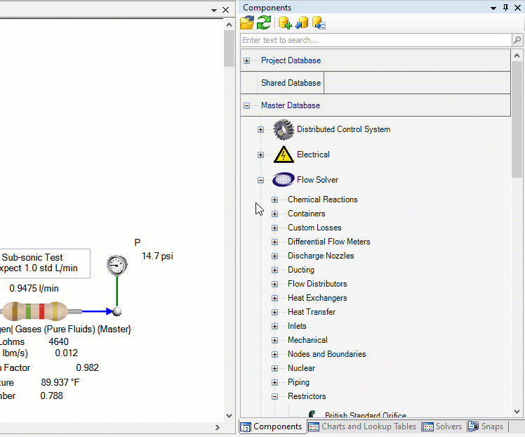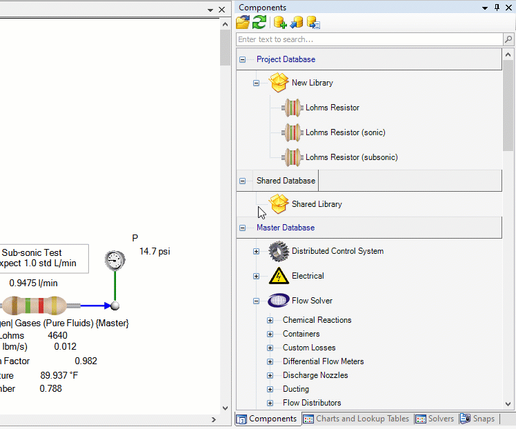 Once we have chosen a location and clicked OK we will see our shared database in both the Components pane and in the Charts and Lookup Tables pane. We’ll need to right-click on the newly created shared database and create a New Library in which we will place our shared components. Creating multiple libraries can be useful when grouping similar components or to discretize between different groups in the organization which are using Flownex.