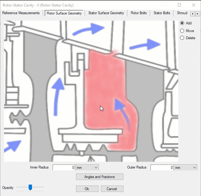 Now that we have specified the reference measurements we can define our rotor and stator surface geometries. This can be done in the Rotor Surface Geometry ribbon and the Stator Surface Geometry ribbon. The mode in the top right of the GUI lets us know if we are adding points, moving points, or deleting points. To add points we will click and drag from the previous point.