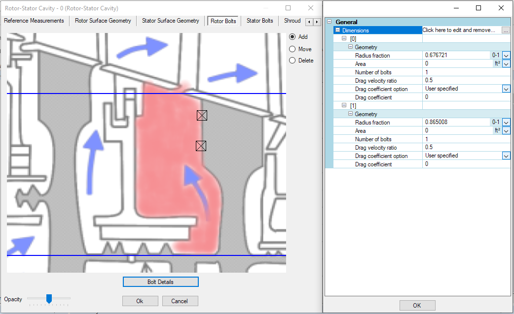 If there are rotor or stator bolts they may be added in their respective ribbons. The blue lines we see in these images represent the limits of the rotor or stator surface. If bolts are added we will need to click Bolt Details at the bottom of the window and add bolt geometry. The radius fraction is populated automatically and the other inputs will need to be updated as needed by the engineer.