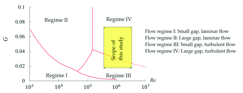 “G” being the gap width ratio (s/a where s is the gap width and a is the outer radius of the cavity) and Re is the Reynolds number for cavity flow. Essentially there are four regimes which are determined by the Reynolds number and gap ratio.