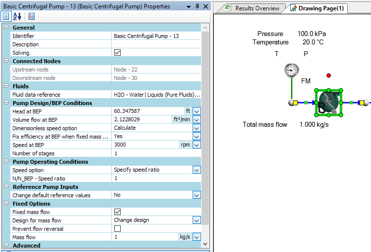 Once we hit solve our pump design inputs will be populated such that our desired mass flow rate is achieved. We can cross-reference these values with available pumps to choose the appropriate component for our network!