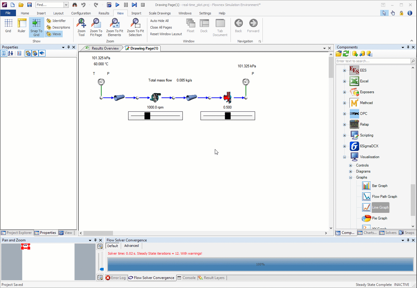 For a time dependent graph we will choose the Line Graph under the Visualization library on the Components pane. We can drag and drop the variables we’d like to see plotted here. I’m going to look at the pump speed (rpm), the valve fraction open, and the mass flow through our network.