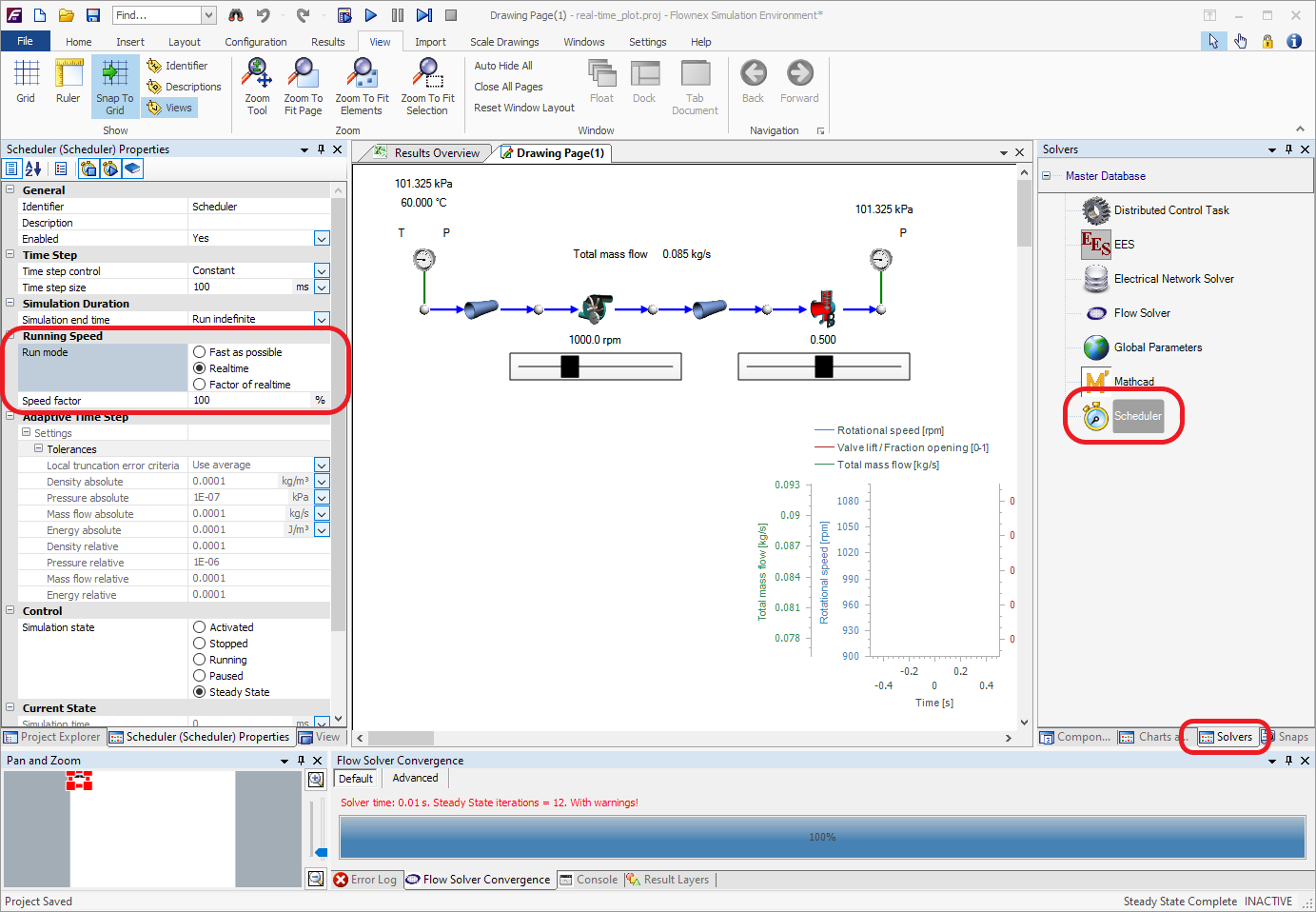 Now when we run our analysis we will get real-time response! This comes in super handy when building human machine interfaces in Flownex for testing operations, when we want to observe response of controls systems, or observing start-up/shut-down type scenarios.