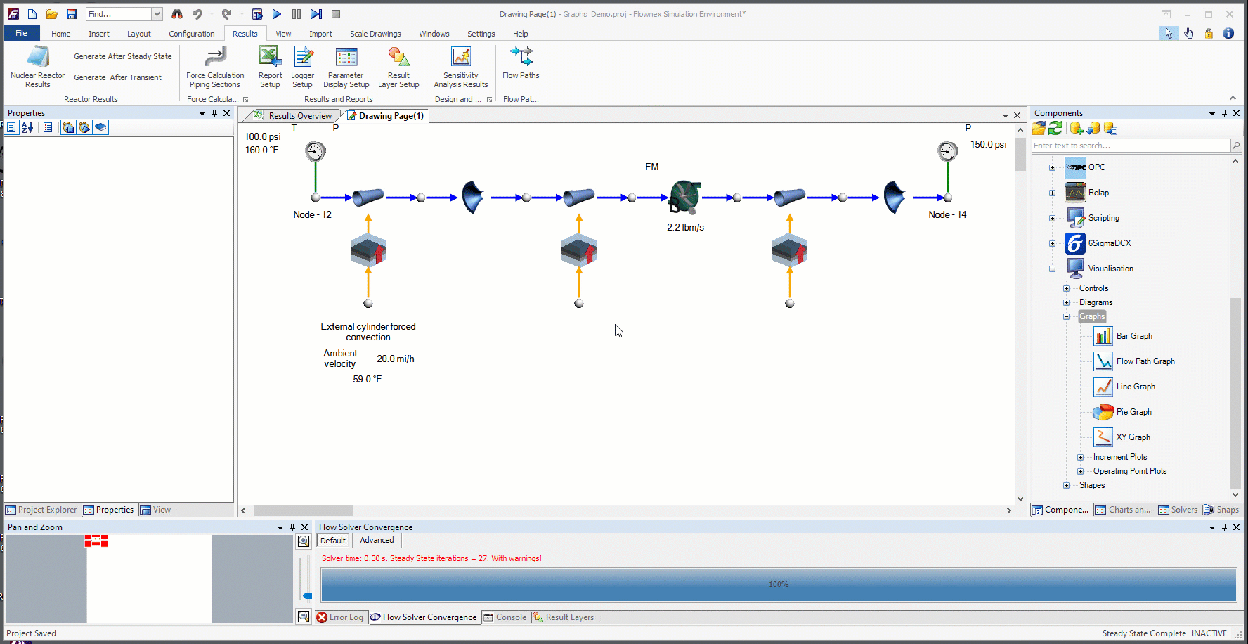The Flow Path Graph is in the component pane under visualization > graphs. Once the graph is added to the canvas we simply need to drag and drop our newly created flow path onto the graph and choose the characteristic we are interested in plotting. We will need to drag and drop the flow path for each characteristic we would like plotted.